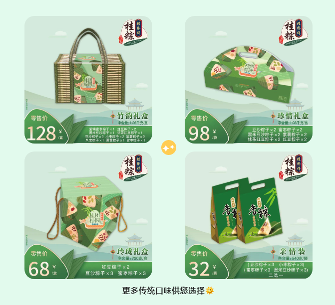 除了以上口味,还有八宝粽子、紫糯蜜枣粽子、抹茶红豆粽子供你选择噢!