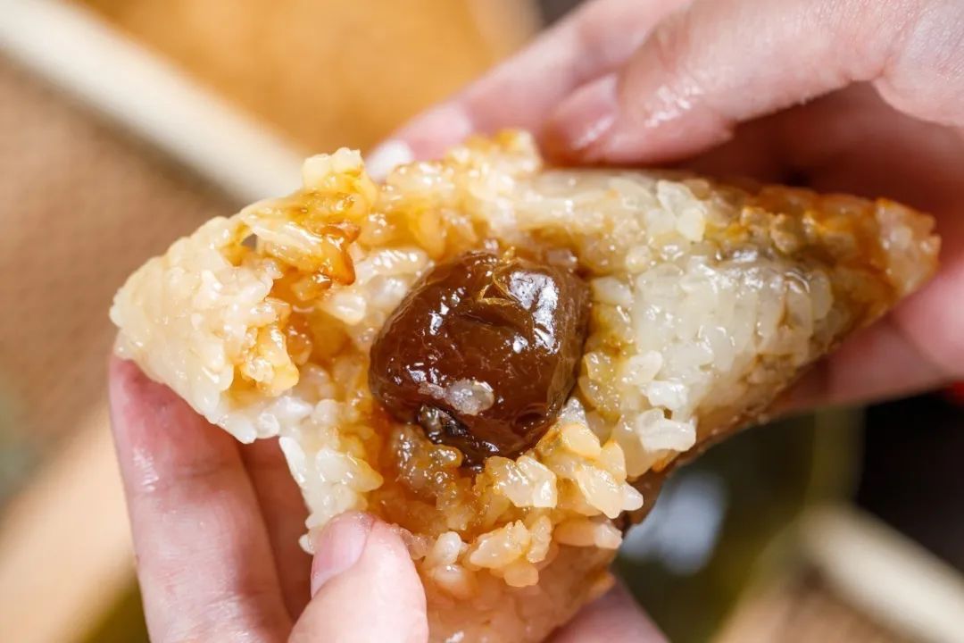 酱红油润的颗颗红枣镶嵌于白色的糯米之中,香飘四溢,彰显星空(中国)官方经典北方粽的本色。