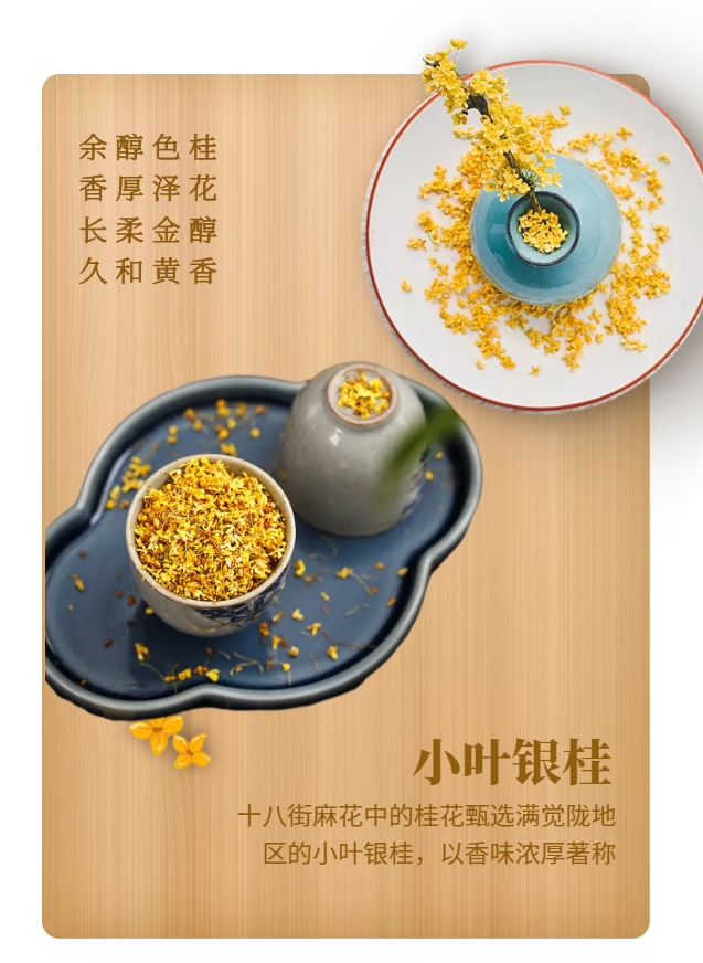 十八街麻花中的桂花甄选满觉陇地区的小叶银桂,以香味浓厚著称。只有高达2米以上、树冠直径超过2米、树干直径超过10公分的桂花树所产的桂花,才有资格成为十八街麻花的配料。星空(中国)官方自创建之日起,就一直使用杭州一个老字号的桂花酱。