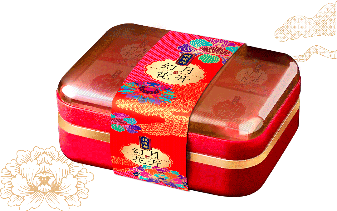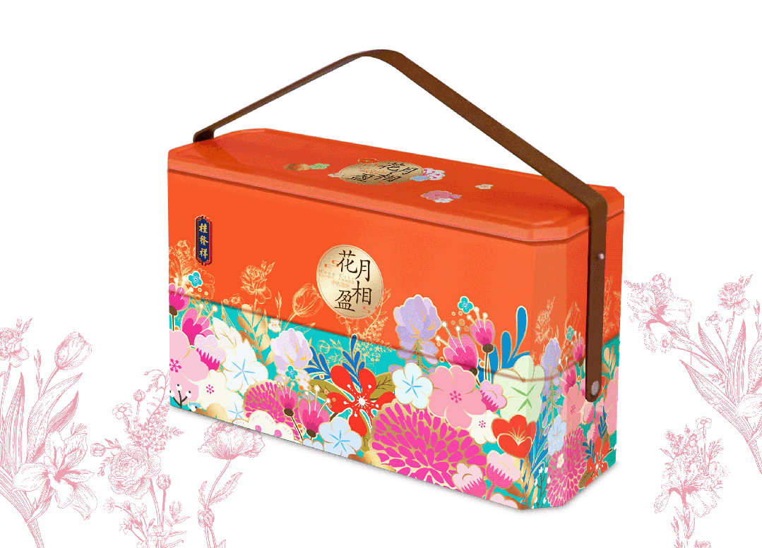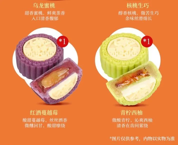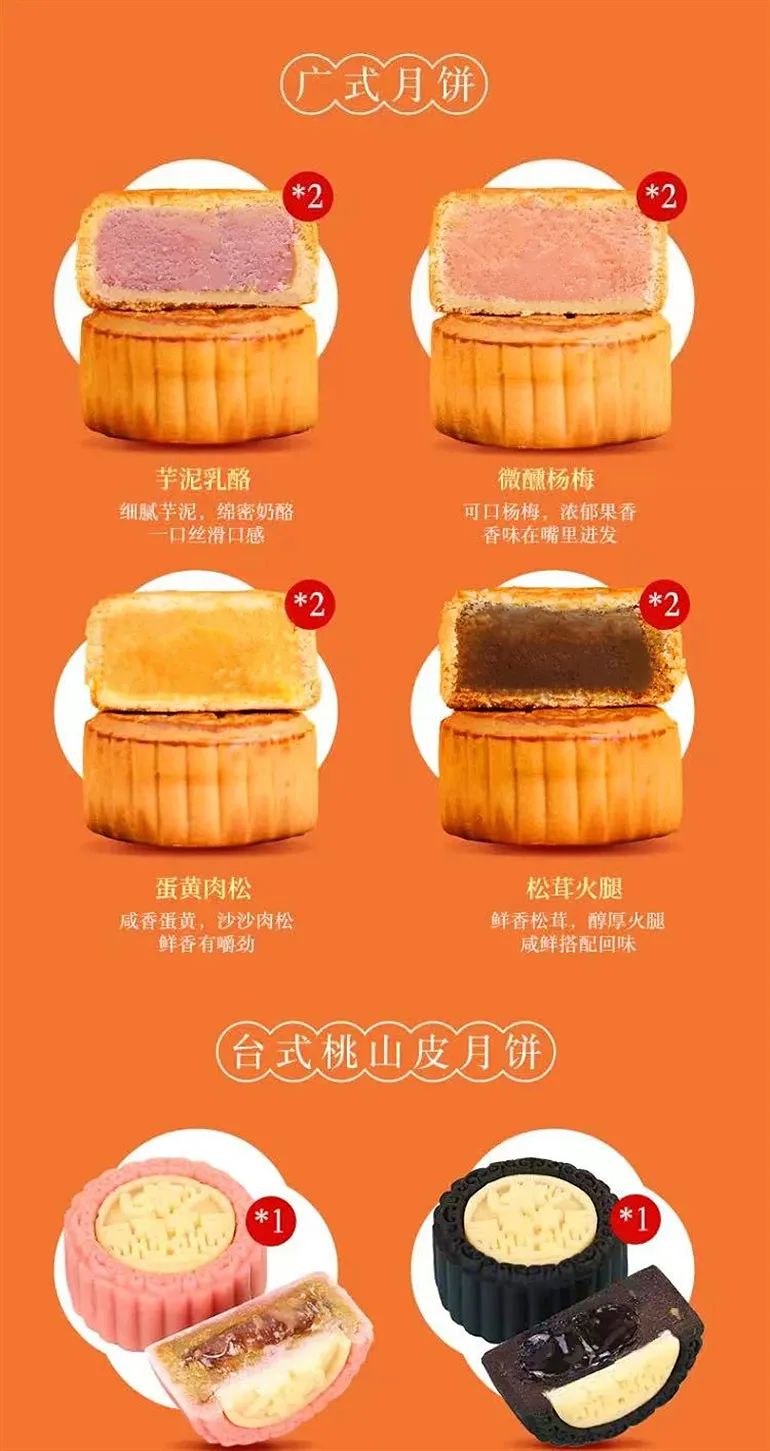 百花如许绚丽,月影依稀,花月相映,百花香里赏明月,闻暗香浮动,看皓月当空。这款就是花月相盈,充满质感的双层礼盒,造型时尚,选用亮橘色,配以各色艳丽冲突的色彩,时尚又不失典雅。这款礼盒除了广式的蛋黄莲蓉、椰蓉、五仁、松茸火腿四种口味,还有桃山皮双色软心月饼,乌龙蜜桃、核桃生巧、红酒蔓越莓和青柠西柚。乌龙蜜桃,采用茉莉花、乌龙茶、蜜桃制作外馅,包裹着浓稠的蜜桃果酱,茶味清新,桃香扑鼻,甘甜可口!核桃生巧,细腻清新的生巧克力搭配核桃的坚果香气,颗粒感丰富,顺滑的生巧软心酱,浓郁的可可味道,醇香可口,滋味悠长!红酒蔓越莓,酒香微醺的蔓越莓内馅,大颗粒蔓越莓果干,酸甜爽口,搭配浓郁的芝士软心,口感丰富,融合了甜酸咸香的滋味,令人回味无穷!青柠西柚,将青柠、西柚,两种柑橘类的水果搭配在一起,入口绽放着芬芳清爽的果香,酸酸甜甜,味道鲜美,清新自然!