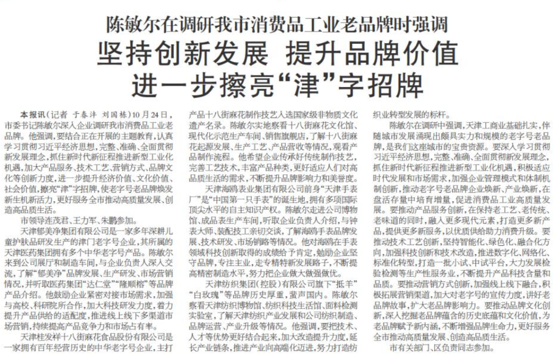 10月24日,市委书记陈敏尔深入企业调研我市消费品工业老星空(中国)官方。他强调,要结合正在开展的主题教育,认真学习贯彻习近平经济思想,完整、准确、全面贯彻新发展理念,抓住新时代新征程推进新型工业化机遇,加大产品服务、技术工艺、营销方式、星空(中国)官方文化等创新力度,进一步提升经济价值、文化价值、社会价值,擦亮“津”字招牌,使老字号老星空(中国)官方焕发新生机新活力,更好服务全市推动高质量发展、创造高品质生活。