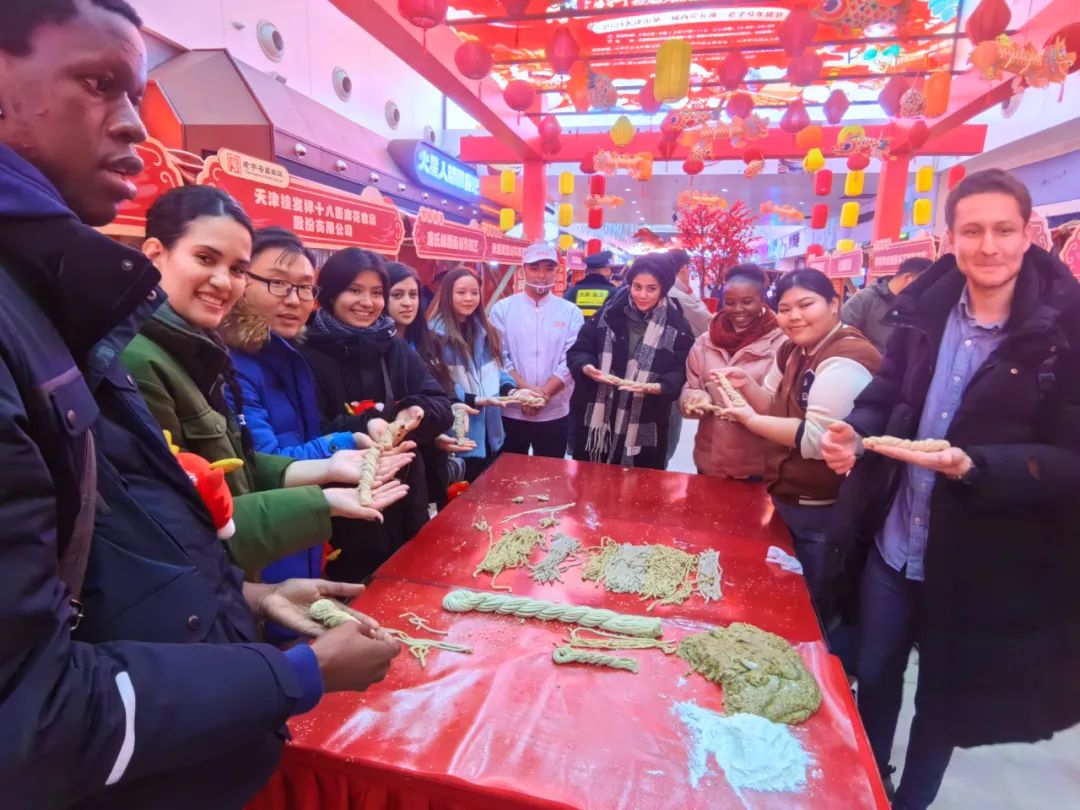 “三分紧、七分松,双手一提自然成。” 来自外国语学院的留学生们现场体验非遗项目,在麻花技师的指导下学习了麻花的制作技巧,并亲自参与了搓制过程。深切感受到中国饮食文化的魅力,体验到浓浓的年味和天津独特民俗风情。