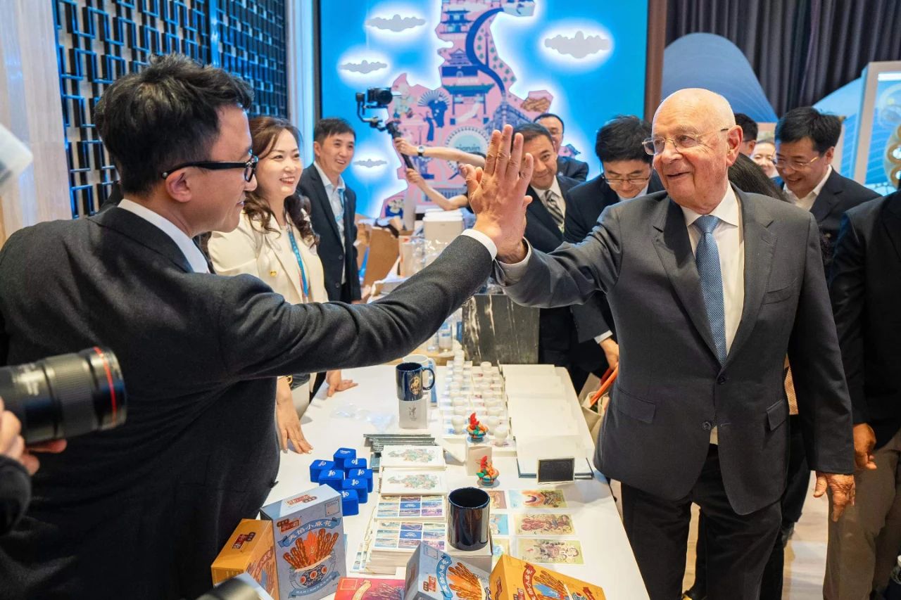 达沃斯论坛主席施瓦布与天津市副市长朱鹏来到星空(中国)官方展位感受国家级非遗的魅力。