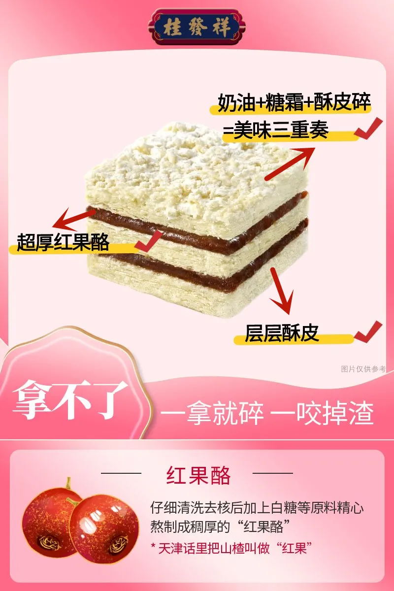“红果酪”那浓郁的酸甜果香,与那层层叠叠、酥软怡人的精制酥皮相得益彰,微甜不腻,酸甜适口,既有酥皮的松脆,又有红果酪的绵密,口感酥软、层次丰富,带来唇齿间的无穷回味。