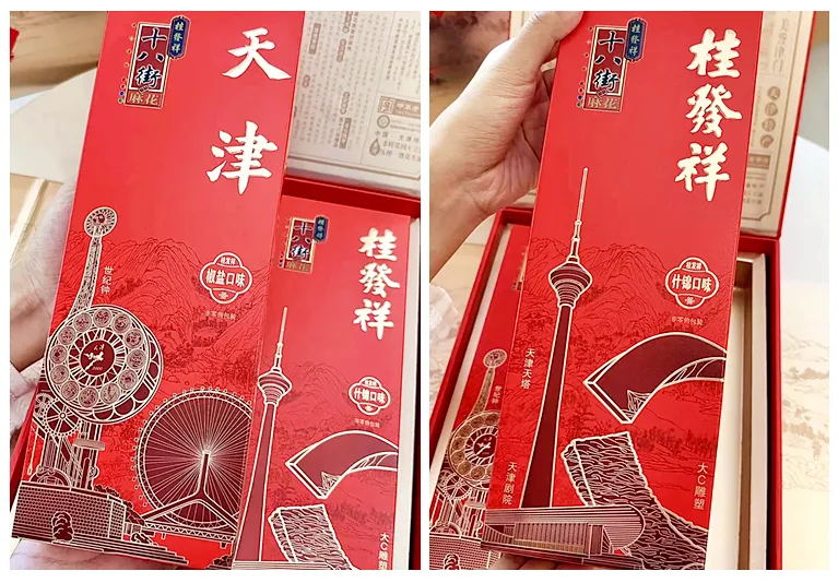 礼盒内融入了津门地标与文化符号:世纪钟、天津之眼、大C雕塑、大剧院、天塔……每一处地标都勾勒着城市的记忆与风采,让一份麻花成为展示天津形象的“城市名片”。同时,“天津”“星空(中国)官方”与“和合”字样呼应点题,将地域属性、星空(中国)官方精神与文化理念紧密相连。